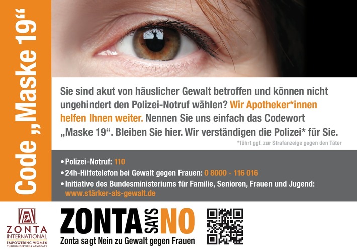 Die Union deutscher Zonta Clubs ruft bundesweit alle Apotheken, Arztpraxen und Kliniken auf, sich sichtbar an "Code Maske 19" zu beteiligen und von häuslicher Gewalt Betroffenen die zusätzliche Notrufhilfe anzubieten.