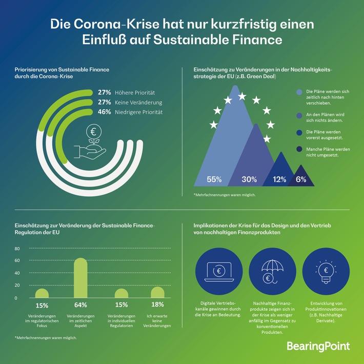 (ots) - Die Corona-Krise hat nach Einschätzung von Experten nur geringfügige Auswirkungen auf den Sustainable Finance-Markt. Das zeigt eine neue Befragung der Management- und Technologieberatung BearingPoint unter mehr als 30 Branchenexperten. Yvonne Quint, Partnerin im Bereich Banking und Capital Markets bei BearingPoint: "Viele Finanzinstitute halten auch in der aktuellen Corona-Krise an nachhaltigen Themen und damit einhergehenden Umsetzungsaktivitäten fest. Die Finanzindustrie sollte die Krise auch als Chance begreifen, um nachhaltige Produkte zu entwickeln bzw. aus dem EU-Aktionsplan resultierende regulatorische Anforderungen umzusetzen, um damit gestärkt aus der Krise zu kommen. Wer dagegen in alte Muster zurückfällt und die Zeit zurückdrehen will, ist für die Zukunft schlecht beraten."