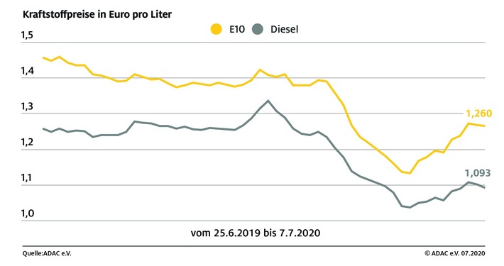 (ots) - Die Kraftstoffpreise an den deutschen Tankstellen sind im Vergleich zur Vorwoche leicht gesunken. Laut aktueller ADAC Auswertung ging der Preis für einen Liter Super E10 im Vergleich zur Vorwoche um 0,9 Cent je Liter auf derzeit 1,260 Euro zurück. Diesel verbilligte sich im selben Zeitraum um 0,6 Cent und kostet aktuell im bundesweiten Durchschnitt 1,093 Euro je Liter.