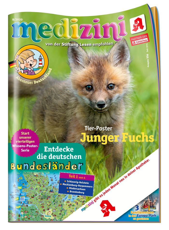 Außerdem noch in der August-Ausgabe von medizini: ein süßes Tierposter zum kleinen Fuchs und alles darüber, wie Füchse, diese kleinen Jäger, aufwachsen. Im Beitrag "Finger weg!" erfahren die Leserinnen und Leser Wissenswertes über Brennnesseln und was hilft, wenn man sich an ihnen "gebrannt" hat. Und natürlich gibt es auch wieder jede Menge Comics, Witze und Rätsel.