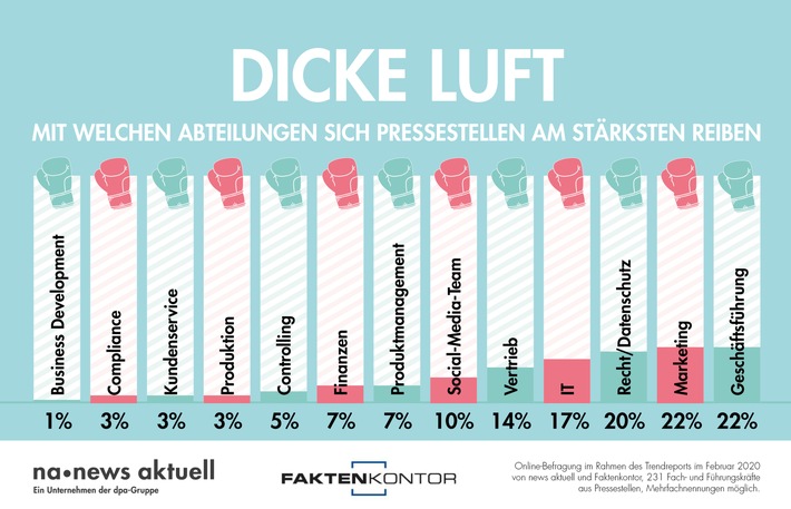 (ots) - Die größten Meinungsverschiedenheiten haben Pressesprecher*innen mit der Geschäftsführung und dem Marketing. Fast genauso häufig kommt es inzwischen auch mit der Rechts- und Datenschutzabteilung zu Konflikten. Das ergab eine Umfrage von news aktuell und Faktenkontor. Die dpa-Tochter und Faktenkontor haben bei PR-Fach- und Führungskräften aus Unternehmen nachgefragt, mit welchen Abteilungen sie die stärksten Auseinandersetzungen haben. Rund 230 Kommunikationsprofis nahmen an der Befragung teil.