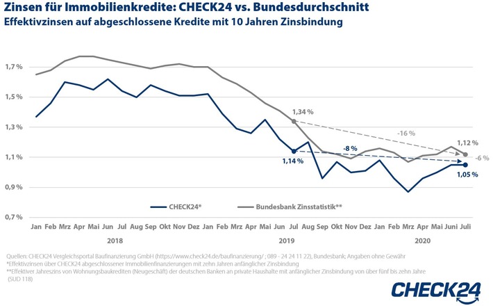 Die Immobilienzinsen bleiben auf einem niedrigen Niveau. Im Juli 2020 zahlten CHECK24-Kunden im Schnitt 1,05 Prozent effektiv für Baudarlehen mit zehn Jahren Zinsbindung. Im Vorjahreszeitraum waren es noch 1,14 Prozent. Das bedeutet eine Senkung um acht Prozent innerhalb eines Jahres.*