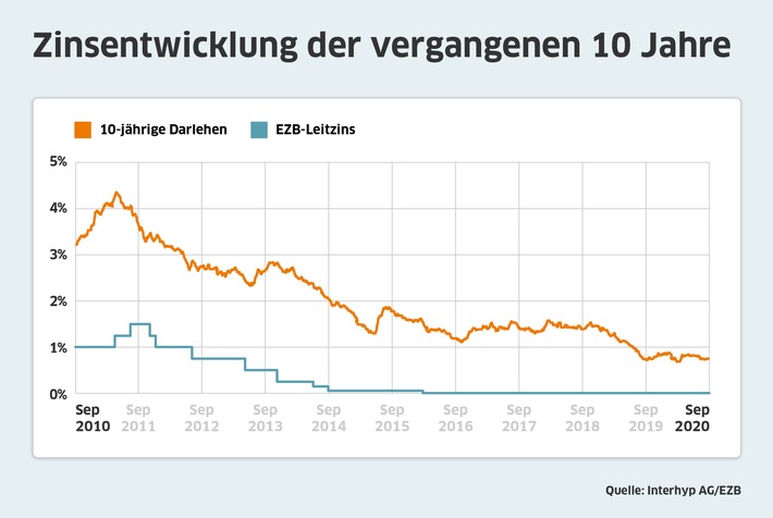 Die Zinsen für Darlehen mit zehnjähriger Zinsbindung liegen laut Interhyp mit rund 0,75 Prozent im Mittel nur knapp über ihrem Allzeittief. Kredite mit fünfjähriger Zinsbindung sind mit rund 0,7 Prozent nur unwesentlich günstiger. Selbst Darlehen mit 15 oder 20 Jahren Zinsfestschreibung können Anfang September für rund 1 Prozent beziehungsweise 1,25 Prozent aufgenommen werden. "Wer Zinssicherheit möchte, muss dafür also kaum tiefer in die Tasche greifen", erklärt Mirjam Mohr. Wie günstig Darlehen aktuell sind, verdeutlicht ein Blick zurück. Das Zinsniveau für Baufinanzierungen liegt heute bei nur etwa einem Viertel der vor zehn Jahren üblichen Konditionen. Die sehr niedrigen Zinsen für Immobilienfinanzierungen ermöglichen laut Interhyp leistbare Kreditraten. Daher bleibt die Immobilie weiter interessant für Eigennutzer und mangels Anlagealternativen auch für Kapitalanleger.