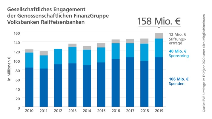 (ots) - Gesellschaftliches Engagement und die Unterstützung der Menschen vor Ort spielen für die 841 Genossenschaftsbanken in Deutschland eine zentrale Rolle. Dies zeigen die Engagementzahlen 2019 der genossenschaftlichen FinanzGruppe erneut auf, die der Bundesverband der Deutschen Volksbanken und Raiffeisenbanken (BVR) in einer aktuellen Umfrage unter seinen Mitgliedsinstituten ermittelt hat. 158 Millionen Euro ließen die Genossenschaftsbanken im Jahr 2019 demnach den Menschen in Deutschland an finanziellen Zuwendungen (Spenden, Sponsoring, Stiftungserträge) zukommen. Ihr gesellschaftliches Engagement erreichte damit einen neuen Höchstwert. Es übertraf den Wert des Vorjahres um knapp 10 Prozent. Beachtlich: Mit einer Summe von insgesamt rund 1,37 Milliarden Euro an finanziellen Zuwendungen unterstützten die deutschen Genossenschaftsbanken in den letzten zehn Jahren ihre Regionen und die Anliegen der Menschen vor Ort.