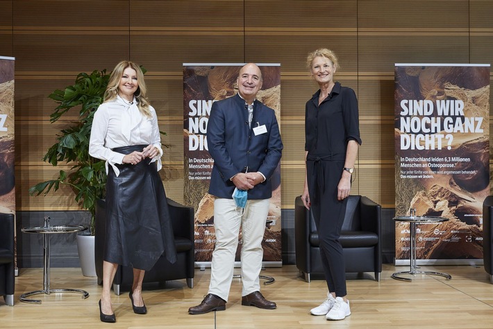Osteoporose beginnt oft schleichend. Bereits ab einem Alter von 35 bis 40 Jahren kann sich unbemerkt jedes Jahr bis zu ein Prozent der Muskel- und Knochenmasse abbauen.[2] Diesem Verlust können körperliche Aktivität und eine gesunde Ernährung mit ausreichend Kalzium und Vitamin D entgegenwirken. "Auch als ehemalige Leistungssportlerin habe ich manchmal Rückenschmerzen. Wenn man im Alter selbstbestimmt leben möchte, muss man frühzeitig aktiv werden und mit dem Arzt sprechen, vor allem, wenn es bereits Osteoporose-Fälle in der Familie gibt", sagt Heike Henkel, Olympiasiegerin im Hochsprung, und neben der Moderatorin Frauke Ludowig Botschafterin der Kampagne KNOCHEN.STARK.MACHER. Neben Rückenschmerzen gehört zu den Anzeichen für eine Osteoporose auch der Verlust an Körpergröße. "Bei über 60-Jährigen kann sich hinter anhaltenden Rückenschmerzen ein unerkannter Knochenbruch verbergen. Daher sollten andauernde Schmerzen ein Anlass zum Arztbesuch sein", mahnte Kurth in der von Frauke Ludowig moderierten Podiumsdiskussion. "Auch ein Nachlassen der Muskelkraft im Alter kann ein Hinweis auf ein Osteoporose-Risiko sein", ergänzte Prof. Dr. med. Hans-Christof Schober, Präsident der Deutschen Gesellschaft für Osteologie e. V. (DGO). "Patienten kommen, wenn sie Schmerzen haben", stimmt Dr. med. Johannes Flechtenmacher, Präsident des Berufsverbandes Orthopädie und Unfallchirurgie (BVOU) zu. "Aber dann kommen wir zu spät, denn die Krankheit ist schon seit Jahren aktiv. Die Behandlung müsste früher ansetzen, doch wir haben in Deutschland kein Screening-Programm." Den verzögerten Behandlungsbeginn bemängelt auch Prof. Dr. med. Wolfgang Böcker, Leiter der Arbeitsgruppe Osteologie der Deutschen Gesellschaft für Unfallchirurgie (DGU): "Die Primärprophylaxe und die Diagnose finden nicht statt. Wir sehen die Patienten dann mit einem Knochenbruch in der Klinik. Allerdings wissen die meisten nicht, was die Ursache für den Knochenbruch ist. Bei einer Befragung unter unseren Patienten wussten 90 Prozent nicht, dass sie eine Osteoporose haben!"