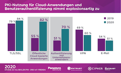 TLS/SSL-Zertifikate für öffentlich zugängliche Websites und Dienste sind der am häufigsten zitierte Anwendungsfall für PKI-Credentials (84% der Befragten). Public Cloud-basierte An- wendungsfälle verzeichneten im Jahresvergleich das schnellste Wachstum (82%, plus 27% gegenüber 2019), gefolgt von der Benutzerauthentifizierung in Unternehmen (70% der Befragten, ein Anstieg von 19% gegenüber 2019). Die Ergebnisse der Studie unterstreichen den entscheidenden Bedarf an PKI zur Absicherung zentraler Unternehmensanwendungen.