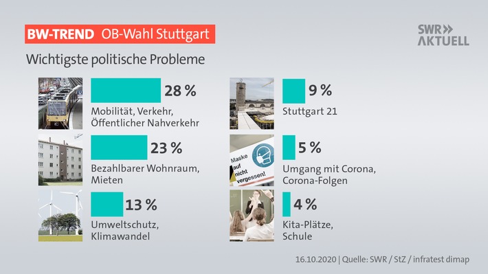 Für die Oberbürgermeisterwahl in Stuttgart am 8. November 2020 würde nach einer Umfrage von Infratest dimap für den SWR und die Stuttgarter Zeitung keiner der Bewerber im ersten Wahlgang die notwendige absolute Mehrheit erreichen. Ein eindeutiger Favorit ist nicht erkennbar.