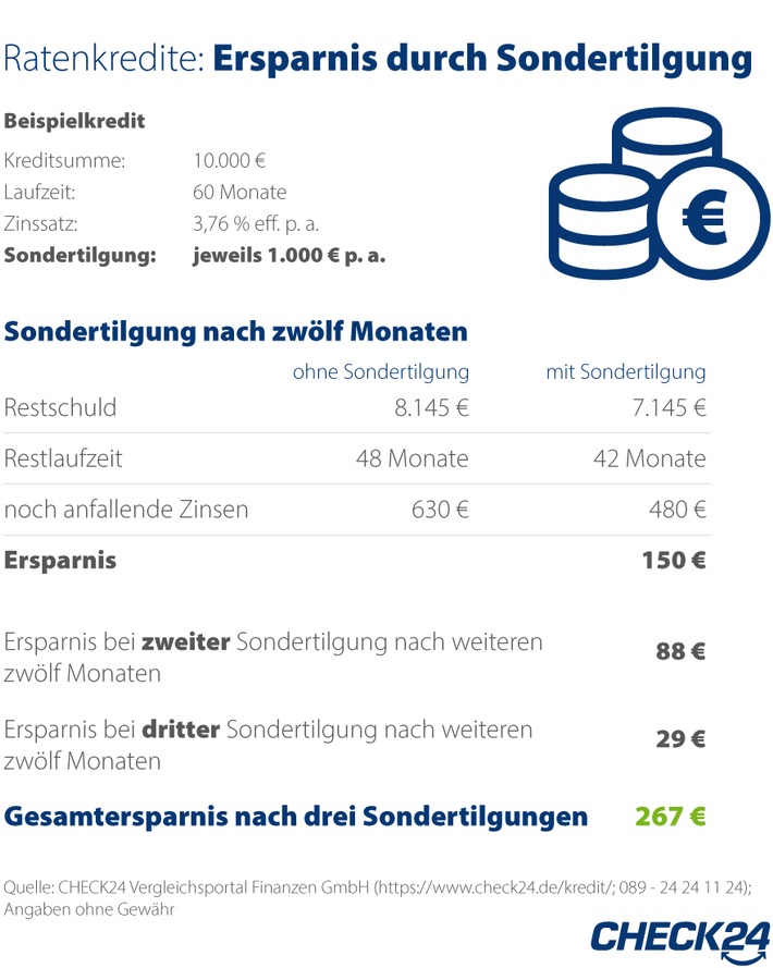 - Einmalige Sondertilgung reduziert Zinskosten im Beispiel um 150 Euro - Verbraucher verkürzen mit Sondertilgung die Kreditlaufzeit erheblich - Über 300 CHECK24-Experten beraten bei Fragen rund um den digitalen Kreditabschluss