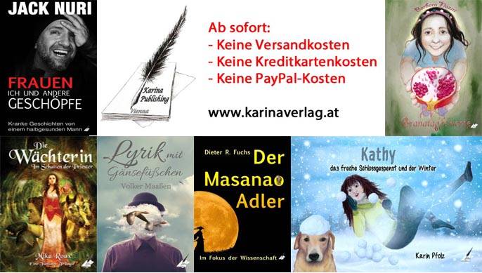 (firmenpresse) - Sie wollen doch wohl nicht ohne Weihnachtsgeschenk da stehen? Deshalb keine Zeit verlieren und direkt bestellen. Ab sofort können Sie Bücher aus dem Online-Shop des Karina-Verlages auch mit Kreditkarte und PayPal bezahlen. Der Verlag verrechnet KEINE Gebühren mehr und keinen Versand, solange dieses Virus uns im Bann hält.