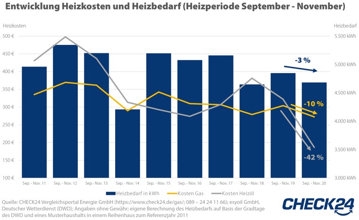 Zwischen September und November 2020 mussten Verbraucher in Deutschland rund drei Prozent weniger Energie fürs Heizen aufwenden als im Vorjahreszeitraum. Dank aktuell verhältnismäßig niedriger Heizölpreise (https://www.check24.de/heizoel/heizoelpreise/) bedeutet das rund 42 Prozent geringere Kosten für Verbraucher mit Ölheizung. Gaskunden zahlen im Vergleich zur Heizperiode September bis November 2019 lediglich zehn Prozent weniger.1;2)