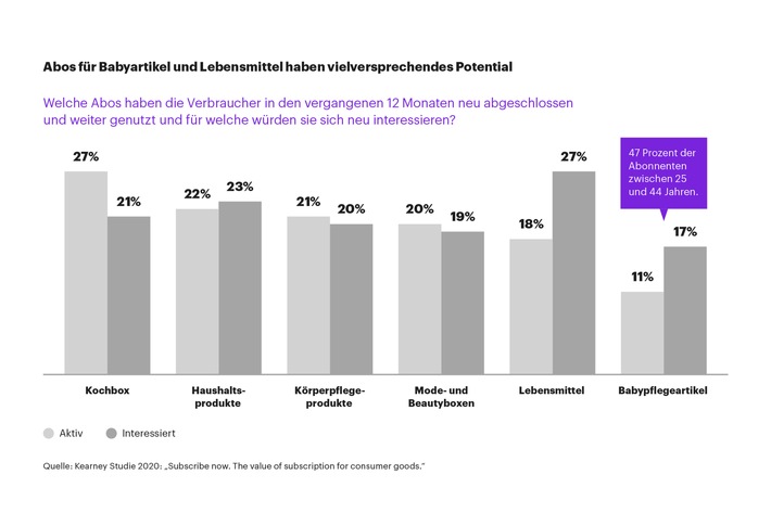 Dabei muss zwischen zwei verschiedenen Modellen unterschieden werden: "Replenishment" füllt regelmäßige Alltagsgegenstände wie Lebensmittel nach, während "Kits", also Abo-Boxen, Produkte rund um ein Thema, zum Beispiel Essen, anbieten, die von Lieferung zu Lieferung variieren. Schoemann: "Unsere Umfrage zeigt: Es sind vor allem drei Gründe, die Menschen dazu bewegen, sich zu einem Abonnement zu verpflichten. Insbesondere für Replenishment-Abonnenten ist es der niedrigere Preis (40 Prozent), gefolgt von der Bequemlichkeit (33 Prozent), wie sie zum Beispiel Lillydoos Windelabonnement anbietet, und drittens dem ,Fun Faktor` (12 Prozent) gerade bei Kits, zum Beispiel beim Weinabonnement von Abothek, das ihre Kunden regelmäßig mit personalisierten Produkten überrascht."
