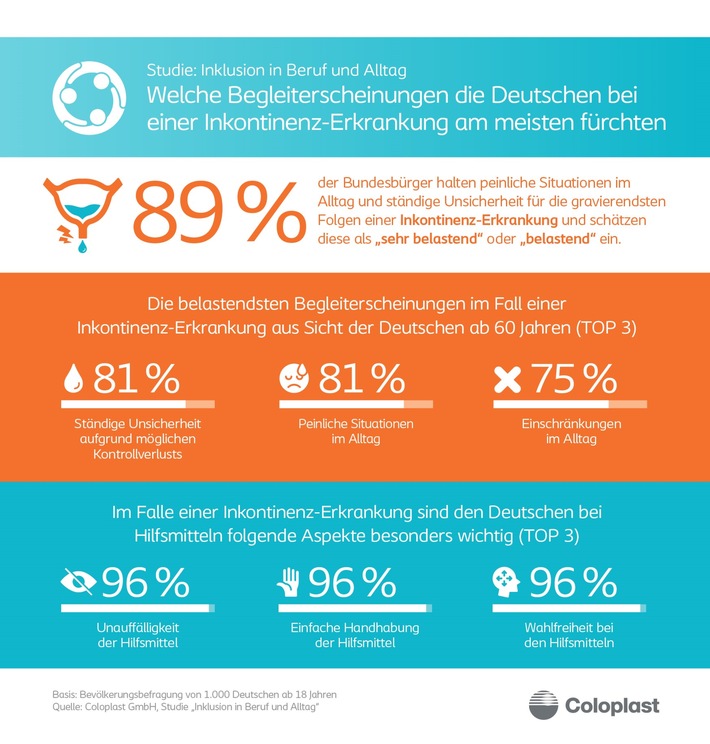(ots) - Peinliche Situationen im Alltag und ständige Unsicherheit: Diese Begleiterscheinungen sehen die Deutschen als die gravierendsten Folgen einer Inkontinenzerkrankung*. 89 Prozent der Bundesbürger halten sie für "sehr belastend" oder "belastend". Weiterer Druck entsteht nach Einschätzung von 83 Prozent durch Einschränkungen im Alltag wie etwa beim Sport oder in der Partnerschaft. Auch die Störung der Nachtruhe stellen sich 81 Prozent anstrengend vor. Das sind Ergebnisse einer repräsentativen Befragung von 1.000 Deutschen im Auftrag der Coloplast GmbH.