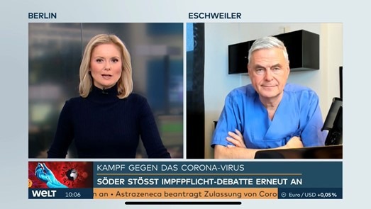 (ots) - Markus Söder hat am heutigen Dienstag im ZDF-"Morgenmagazin" eine Debatte für eine Impfpflicht von Pflegekräften angestoßen. Hierzu Prof. Dr. Uwe Janssens, Chefarzt der Klinik für Innere Medizin und Kardiologie im St.-Antonius-Hospital Eschweiler, bis Ende 2020 Präsident der Deutschen Interdisziplinären Vereinigung für Intensiv- und Notfallmedizin e.V., exklusiv auf WELT Nachrichtensender.