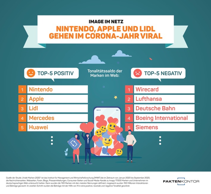 Welche Marken konnten 2020 im Internet von sich reden machen? Den eigenen Namen im Web rasant verbreiten und diese Popularität für sich am besten nutzen konnte der Videospiel- und Konsolenhersteller Nintendo. Auch der Technologiekonzern Apple konnte als virale Marke im Netz punkten. Auf Platz 3 der viralen Marken 2020 schafft es der Discounter Lidl, der mit einer starken Digital-Kampagne erfolgreich bei jungen, online-affinen Nutzern war. Dies sind Ergebnisse einer Studie von Faktenkontor und dem Institut für Management- und Wirtschaftsforschung (IMWF), für die umfassend Beiträge und Erwähnungen von Unternehmen und Marken auf deutschsprachigen Nachrichtenseiten, in Foren, Blogs, Pressemitteilungen und Social-Media-Kanälen ausgewertet wurden.