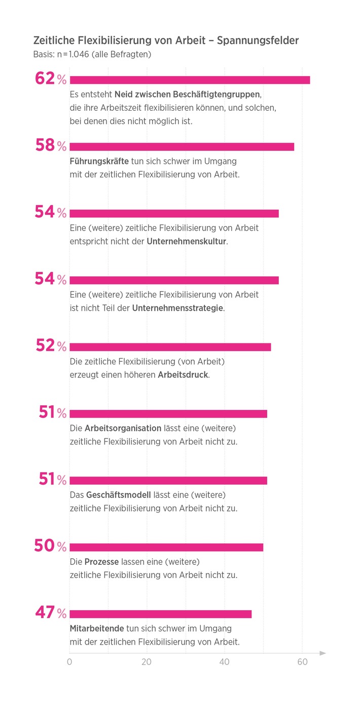 Die Ergebnisse zeigen: Arbeiten, unabhängig von Ort und Zeit, wird von der Mehrheit der befragten Unternehmen ermöglicht. Diese Maßnahme geht allerdings mit Spannungen zwischen den Beschäftigtengruppen einher. So hat die Coronakrise Unternehmen und Arbeitnehmer zu einer Flexibilität getrieben, deren Durchdringung man noch vor einem Jahr für unmöglich gehalten hätte. 61 Prozent der Befragten berichten von einer zeitlichen Flexibilisierung der Arbeit.
