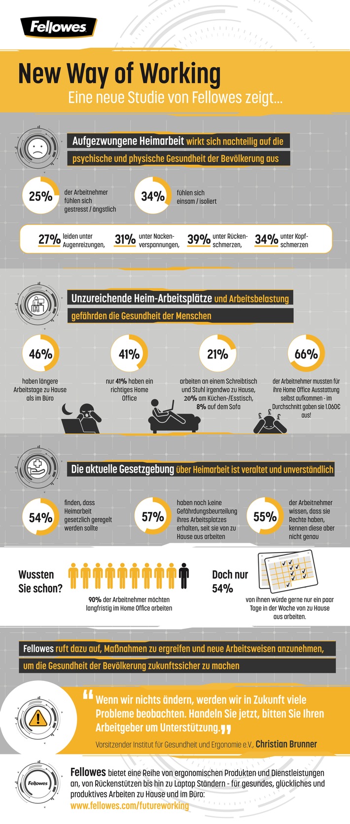 Fellowes, der führende Anbieter von innovativen Lösungen für gesunde und ergonomische Arbeitsplätze, hat eine Studie zu den Auswirkungen des Home Offices durchgeführt. Untersucht wurde die körperliche und geistige Belastung von Büroangestellten, die seit Beginn der Corona-Pandemie von zu Hause aus arbeiten. Dazu wurden 1.000 Arbeitnehmer in Deutschland befragt, die seit mindestens vier Monaten im Home Office arbeiten. Ende 2019 hat Fellowes mit der Figur EMMA bereits auf die körperlichen Folgen von unzureichend ausgestatteten Büroarbeitsplätzen aufmerksam gemacht. Die neue Studie belegt nun, dass Home Office Symptome wie Rücken-, Kopf-, oder Nackenschmerzen sogar verstärkt und für viele Arbeitnehmer auch die psychische Belastung steigt.