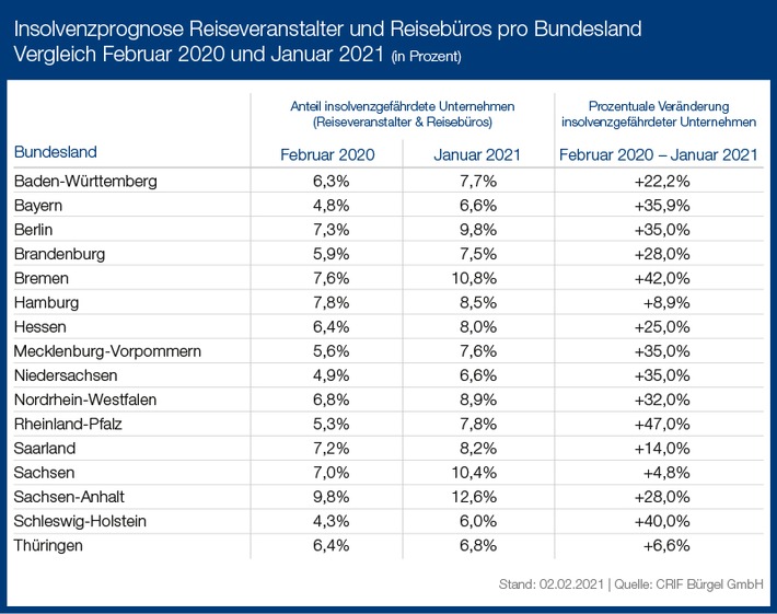 Ein Blick auf die regionalen Zahlen zeigt, dass das Insolvenzrisiko aus Unternehmen aus der Reisebranche in allen Bundesländern angestiegen ist. Besonders deutlich in Rheinland-Pfalz (plus 47 Prozent), Bremen (plus 42 Prozent) und in Schleswig-Holstein (plus 40 Prozent).