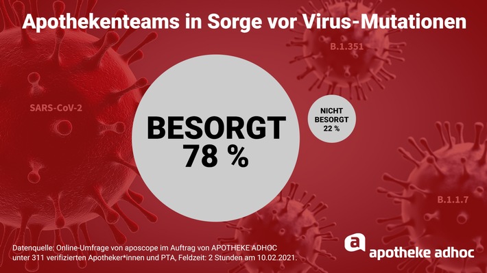 Hinweis zur Methodik: Im Auftrag von APOTHEKE ADHOC befragt aposcope seit Februar 2020 regelmäßig verifizierte Apotheker*innen und PTA online zum Thema Coronavirus. An der aktuellen Umfrage nahmen am 10. Februar 2021 insgesamt 311 Apotheker*innen und PTA teil.