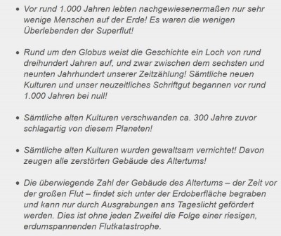 Vor rund 1.000 bis 1.300 Jahren muss etwas Schreckliches mit der Erde geschehen sein. Die große Katastrophe, die Superflut, muss frühestens vor 1.000 bis 1.300 Jahren geschehen sein, dafür sprechen viele Fakten.