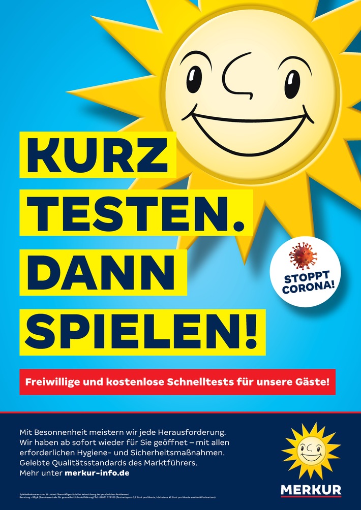 Kurz testen, dann spielen - unter diesem Motto bereitet sich MERKUR SPIEL, Deutschlands führende Spielstättenkette, auf das Ende des Lockdowns vor. Zusätzlich zum ganzheitlichen Hygienekonzept will das Unternehmen freiwillige und kostenlose Corona-Schelltests anbieten.