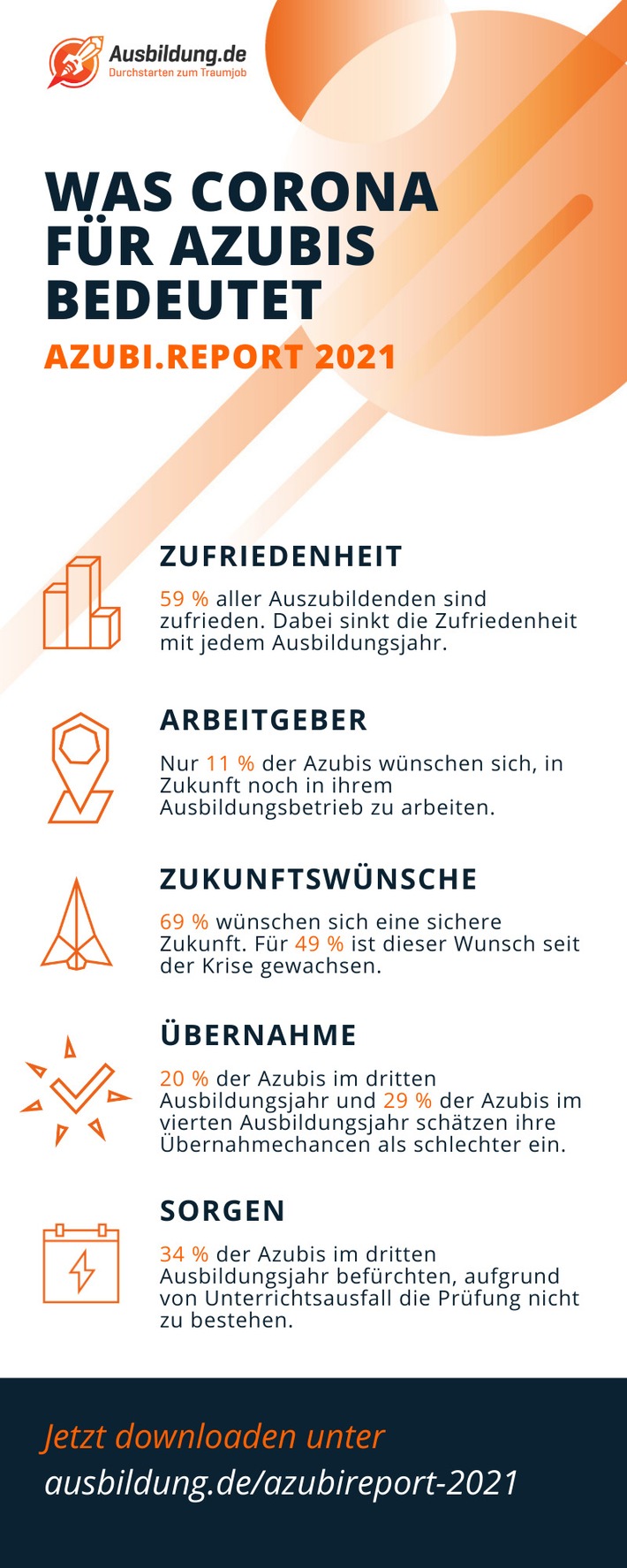 Ausbildung.de ist mit 2,4 Millionen Besucher:innen im Monat das reichweitenstärkste Ausbildungsportal Deutschlands. Was Auszubildende bewegt, ermittelt das Portal seit 2015 mit dem azubi.report. Der azubi.report 2021 ist ab sofort kostenlos unter www.ausbildung.de/azubireport-2021 erhältlich. Mehr zu Ausbildung.de unter www.ausbildung.de/info.