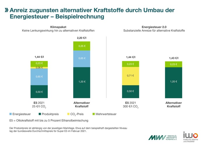 "Ein entscheidendes Ergebnis der Studie ist: Mit einer Energiesteuer 2.0 lässt sich - zusammen mit dem bestehenden Brennstoffemissionshandelsgesetz - bei fossilem Benzin und Diesel kurz- bis mittelfristig ein Preis von 300 bis 400 Euro je emittierte Tonne CO2 realisieren. Und das, ohne die Verbraucher spürbar höher zu belasten, da die bisherige Energiesteuer ja durch die neue Energiesteuer 2.0 ersetzt wird", sagt MWV-Hauptgeschäftsführer Prof. Christian Küchen. "Unsere Botschaft an die Politik ist: Mit einer solchen Steuerreform wird ein unbürokratischer Anreiz geschaffen, in alternative Kraftstoffe zu investieren und somit zum Klimaschutz auch im Fahrzeugbestand beizutragen."