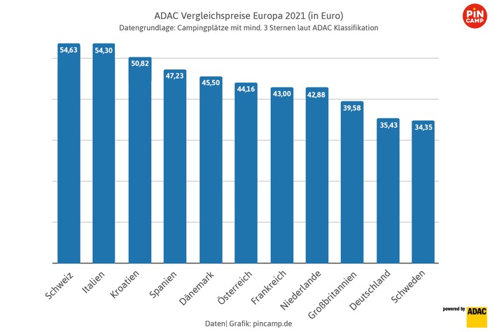 Berlin (ots) - Vor dem Start der Campingsaison veröffentlicht PiNCAMP (https://www.pincamp.de/), das Campingportal des ADAC, die ADAC Vergleichspreise*) für Camping in Deutschland und Europa. Diese Erhebung basiert auf den Preis-Angaben von über 5.500 Campingplätzen für eine Übernachtung in der Hochsaison. Das Ergebnis: Deutsche Camper übernachten im eigenen Land nach wie vor besonders preiswert. Nach einer Preiserhöhung gegenüber dem Vorjahr um 1,50 Euro zahlt eine Camperfamilie mit zwei Erwachsenen und einem 10-jährigen Kind 2021 hierzulande durchschnittlich 35,43 Euro pro Übernachtung. Deutschland ist somit zusammen mit Schweden (34,35 Euro) erneut günstigstes europäisches Campingland.