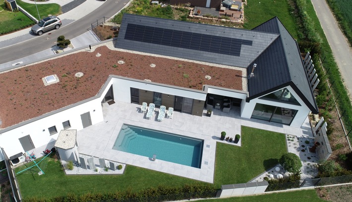 Wenn rund um den Erdball am 3. Mai 2021 zum 43. mal der "Tag der Sonne" ausgerufen wird, dann hat für Familie Elberlein die solare Zukunft mit dem feurigen Zentrum unseres Planetensystems als Energielieferant bereits begonnen: Beim Neubau für den zweiten Lebensabschnitt haben sie vieles berücksichtigt, "was uns das Leben einfacher, umweltfreundlicher und gleichzeitig autarker macht." Für das Wohlbefinden im ebenerdigen Bungalow sorgen natürliche Farben und Materialien, für viel Bewegungsraum großzügige Flächen und für eine möglichst unabhängige Energieversorgung das smarte Dach: "Damit können wir uns ohne schlechtes Klimagewissen sogar den Luxus eines beheizten Pools leisten." Und das ökologisch wie ökonomisch: Den grünen Strom für Haus- und Klimatechnik liefert nahezu unsichtbar ein elegantes Schieferdach. Dort treffen 400 Millionen Jahre in der Erde gereifte Steine auf Solartechnik des 21. Jahrhunderts: Zwischen den modernen Rechtecksteinen verstecken sich passgenau und bündig mit den Schiefersteinen leistungsfähige monokristalline Silicium Solarmodule. Die rahmenlosen und nur 4,5 Kilo schweren Elemente werden bei der Neueindeckung mit dem Rathscheck Schiefer-System in einem Arbeitsgang zeitsparend verlegt - oder später, wenn der Bedarf vielleicht steigen sollte, im Handumdrehen einfach nachgerüstet. Unkompliziert wie der Installationsvorgang ist die gesamte Technik: Die in den Photovoltaikelementen verborgenen Solarzellen wandeln natürliche Sonnenstrahlung in Energie um, ein Wechselrichter erzeugt aus dem solaren Gleichstrom netzüblichen Wechselstrom, der selbst verbraucht, gespeichert oder ins Stromnetz eingespeist werden kann. Da sich die Einspeisevergütungen nach dem Erneuerbare-Energien-Gesetz (EEG 2021) für Neuanlagen kontinuierlich reduzieren - zur Zeit gibt es für die meisten privaten Neuinstallationen noch knapp unter 8 Cent pro Kilowattstunde - lohnt sich in Zukunft vor allem der selbst genutzte Solarstrom: "Unabhängigkeit von steigenden Strompreisen in Verbindung mit umweltfreundlicher erneuerbarer Energie - das war genau unsere Motivation," erzählt Günther Elberlein.