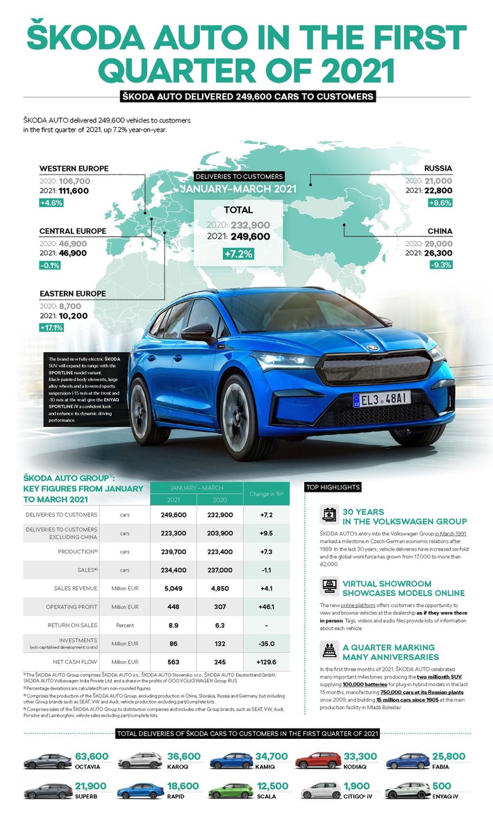 Von Januar bis März liefert SKODA AUTO weltweit 249.600 Fahrzeuge an Kunden aus (erstes Quartal 2020: 232.900 Fahrzeuge; +7,2 %).