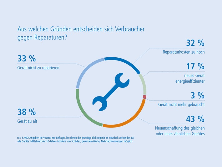 Weshalb entscheiden sich Verbraucher mehrheitlich gegen eine Reparatur defekter Geräte? Jeder Dritte bezeichnet zu hohe Reparaturkosten als ausschlaggebend, 43 Prozent nennen Neuanschaffungen als Grund gegen eine Reparatur.