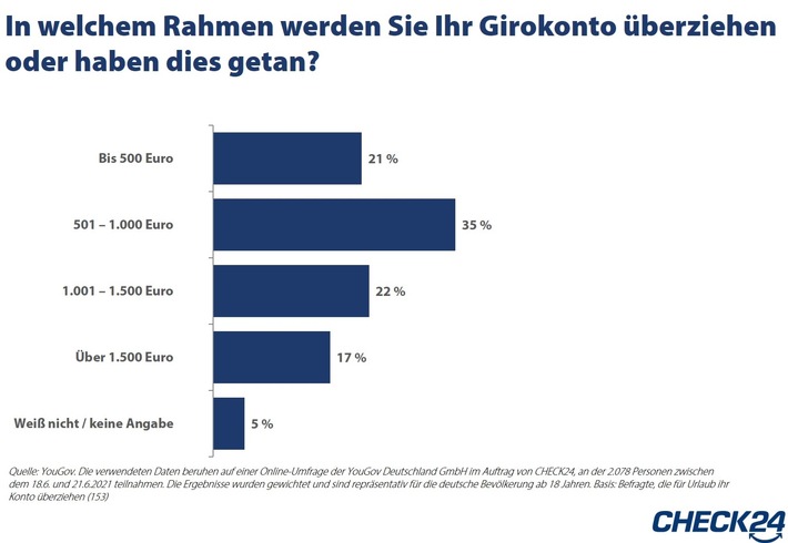 München (ots) - Nach den Lockerungen der Corona-Reisebestimmungen ist die Urlaubssehnsucht vieler Deutscher groß. Laut einer repräsentativen YouGov-Umfrage im Auftrag von CHECK24 werden 45 Prozent der Befragten in diesem Jahr Urlaub machen und dafür Geld ausgeben (https://www.check24.de/files/p/2021/1/9/e/16726-2021-06-25_check24_zusaetzlichegrafik1_ratenkrediturlaub.jpg)oder haben dies schon getan.1) Finanzielle Engpässe stellen dabei kein Hindernis dar: 17 Prozent der Urlauber*innen sind bereit, für die Urlaubskosten ihr Konto mit einem Dispositionskredit zu überziehen (https://www.check24.de/files/p/2021/e/e/8/16727-2021-06-25_check24_zusaetzlichegrafik2_ratenkrediturlaub.jpg) - das entspricht einem Bevölkerungsanteil von fünf Millionen Deutschen.2) Dabei nutzen zehn Prozent der Verbraucher*innen, die für Urlaub Geld ausgeben, den Überziehungsrahmen für einen Teil der Urlaubskosten. Sieben Prozent finanzieren die kompletten Ausgaben per Dispo. Vier Prozent nutzen für den Urlaub einen Ratenkredit.