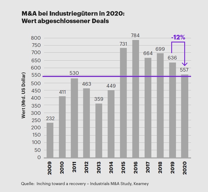 "In der Industriegüterindustrie ist das weltweite Transaktionsvolumen auf den niedrigsten Stand seit 2015 Jahren abgesackt", bilanziert Astrid Latzel, Partnerin bei der Managementberatung Kearney und Mitautorin des aktuellen Kearney Berichts über Fusionen und Akquisitionen in der Branche. "Damit haben wir die Talsohle erreicht", so Latzel: "2021 werden wir dank der Impferfolge und geopolitischer Stabilisierung eine Wiederbelebung des Marktes sehen. Besonders in den Industrien für Medizintechnik, Gesundheit und Elektronik, aber auch in der Automobilindustrie sind die Unternehmen auf Einkaufstour."