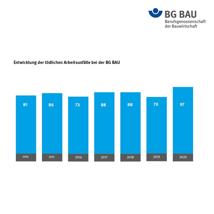 (ots) - Im Jahr 2020 gab es weniger Arbeitsunfälle in der Bauwirtschaft und im Bereich baunaher Dienstleistungen als 2019. Die Zahl der tödlichen Arbeitsunfälle ist jedoch deutlich gestiegen. Insgesamt 97 Beschäftigte kamen im vergangenen Jahr durch einen Arbeitsunfall ums Leben, viele davon durch einen Absturz von höher gelegenen Arbeitsplätzen. So die Bilanz der Berufsgenossenschaft der Bauwirtschaft (BG BAU), die heute die Zahlen zur Entwicklung von Arbeitsunfällen und Berufskrankheiten im Jahr 2020 vorgelegt hat.