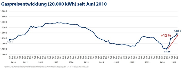 München (ots) - Gas (https://www.check24.de/gas/) wird seit Monaten teurer. Im Juni 2021 kosten 20.000 kWh Gas 1.289 Euro - zwölf Prozent mehr als im Oktober 2020. 20.000 kWh Gas kosteten im Oktober noch 1.152 Euro, das ist der niedrigste Wert im betrachteten Zeitraum seit 2010. In der Grundversorgung erreichte der Gaspreis (https://www.check24.de/gas/gaspreise/) sogar ein Rekordniveau: 1.515 Euro.1)