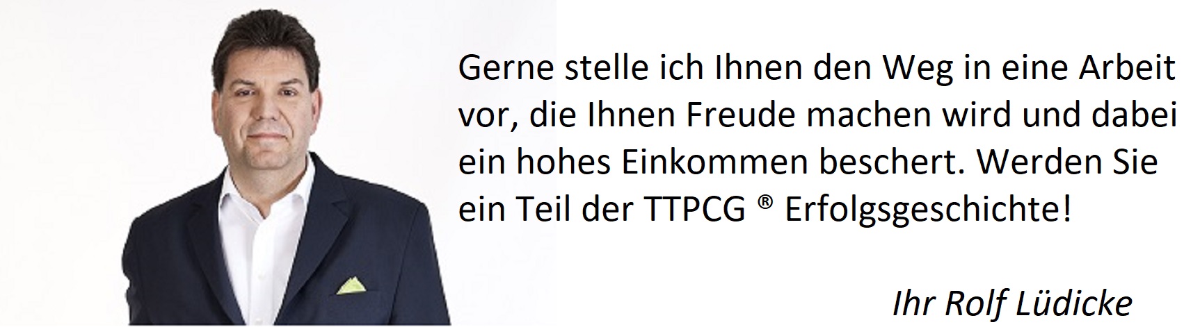 Machen Sie jetzt den ersten Schritt zu Ihrem Glück. Gerne lädt Herr Master Center Manager Rolf Lüdicke zu einem ersten Telefonat und einer anschliessenden Beratung ein - natürlich honorarfrei in Hockenheim. Profitieren Sie von dem TTPCG ® Markt-Know-how und einer Vielzahl von begleiteten Marketingkampagnen.