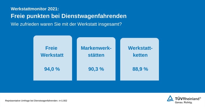 Dienstwagenfahrerinnen und Dienstwagenfahrer sind sehr zufrieden mit ihrer Werkstatt. Das zeigen die Ergebnisse des TÜV Rheinland-Werkstattmonitors 2021 (https://www.tuv.com/werkstattmonitor2021). Für die Studie befragte TÜV Rheinland im Juni und Juli 2021 erstmals gezielt Dienstwagenfahrerinnen und -fahrer nach ihren Erfahrungen mit freien Werkstätten, Marken- oder Vertragswerkstätten sowie Werkstattketten. Der Online-Erhebung zufolge sind 94 Prozent der 1.000 Befragten mit den freien Werkstätten sehr zufrieden oder zufrieden, bei den Markenwerkstätten sind es 90,3 Prozent, bei den Werkstattketten 88,9 Prozent.
