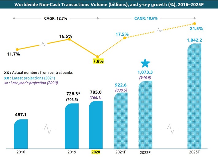 Es wird erwartet, dass die Ausgaben im Jahr 2021 gegenüber 2020 ansteigen werden und damit auch 2021 wieder bargeldlosen Transaktionen zunehmen. Sofortzahlungen, elektronisches Geld und die Zahlungsmethoden der nächsten Generation wie Buy Now Pay Later (BNPL), unsichtbare (sogenannte Invisible Payments) und biometrische Zahlungen sowie Kryptowährung, werden die Zunahme an bargeldlosen Transaktionen beschleunigen. Nach acht Jahren eines zweistelligen Wachstums verlangsamte sich der globale Anstieg an bargeldlosen Transaktionen von 16,5 Prozent im Jahr 2019 auf 7,8 Prozent im Jahr 2020, was auf die zögerliche Haltung der Zahlenden bei unsicheren Marktbedingungen aufgrund der Pandemie zurückzuführen ist. Der World Payments Report prognostiziert dennoch, dass die weltweiten bargeldlosen Transaktionen im Durchschnitt um 18,6 Prozent im Zeitraum von 2020 bis 2025 wachsen werden. Bis Ende 2025 erwartet man voraussichtlich ein Volumen von 1,8 Billionen bargeldlosen Transaktionen.