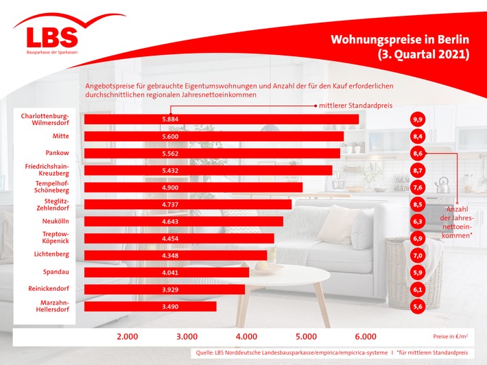 Die teuersten Wohnungen finden sich im Zentrum Berlins. Spitzenreiter ist der Bezirk Charlottenburg-Wilmersdorf mit einem Standardpreis von 5.884 Euro pro Quadratmeter. Bei einem Wohnungspreis von 430.000 Euro muss ein durchschnittlicher Berliner Haushalt hier rund zehn Jahresnettoeinkommen für den Kauf aufbringen.