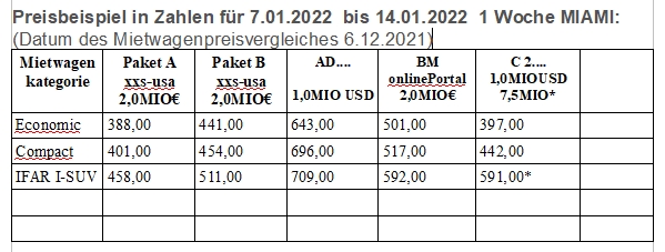 Preisbeispiel in Zahlen für 7.01.2022 bis 14.01.2022 1 Woche MIAMI:
