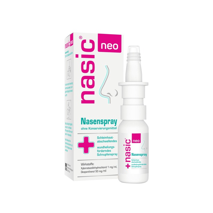 Die Nasenschleimhaut ist enorm wichtig, wenn es um die Abwehr von Erkältungserregern geht. Wer seine Erkältung schnell wieder loswerden möchte, sollte auch die Heilung der geschädigten Nasenschleimhaut gezielt unterstützen, damit diese sich regenerieren kann für die Abwehr von weiteren Krankheitserregern. Das Kombispray nasic® neo enthält daher die Wirkstoffkombination aus Xylometazolin und pflegendem Dexpanthenol. Xylometazolin wirkt abschwellend und sorgt dafür, dass die Atmung durch die Nase wieder leichter fällt. Der Wirkstoff Dexpanthenol pflegt und unterstützt die Heilung der Nasenschleimhaut, die durch das ständige Schnäuzen in Mitleidenschaft gezogen wird.