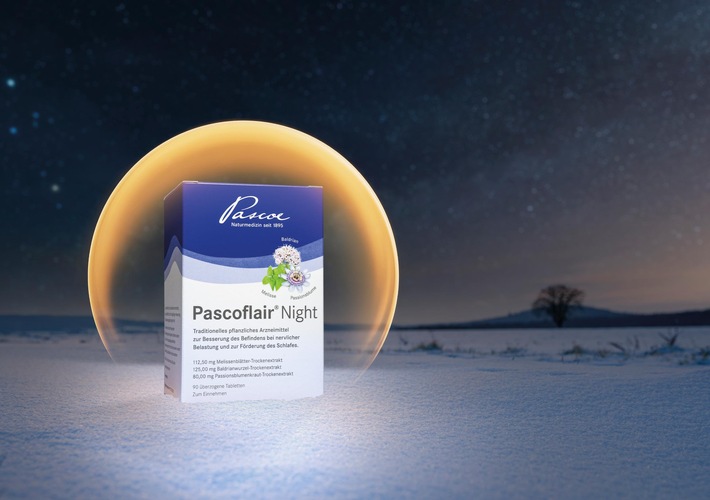 Doch wie finde ich den Weg in einen gesunden und erholsamen Wohlfühlschlaf? Nicht selten fehlen die mentale Entspannung und die Fähigkeit, kreisende Gedanken einfach loslassen zu können, um in den Schlaf zu finden. Schon lange haben sich die Passionsblume, Baldrian und Melisse als Heilpflanzen bewährt. In unserem Arzneimittel Pascoflair® Night ergänzen sie sich zu einer harmonischen Mischung - entspannend und schlaffördernd. Das pflanzliche Arzneimittel ist für Heranwachsende ab 12 Jahren zugelassen und frei von Titandioxid, Gluten, Laktose und Gelatine.