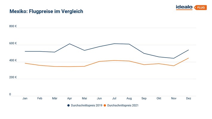 Die Datenerhebung zeigt zwar, dass größere Preistrends, egal ob Preissteigerungen oder Preisdumping, über das gesamte Jahr kaum zu erkennen sind - dennoch ließen sich vor allem für beliebte Sommerziele wie Mallorca oder Mexiko zum Teil deutlich geringere Preise als noch 2019 ermitteln: Für einen Hin- und Rückflug nach Mexiko mussten Reisende in diesem Jahr durchschnittlich 21 Prozent weniger zahlen als noch 2019. Waren Flüge 2019 selten unter 500 Euro zu bekommen, gab es diese 2021 zum Teil schon für unter 350 Euro.