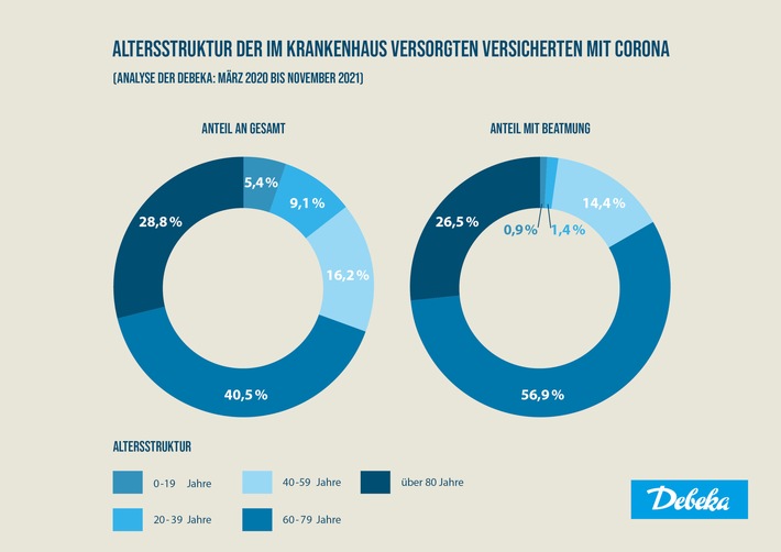 Die Auswertung bezieht sich auf bei der Debeka eingegangene Rechnungen für stationäre Leistungen zwischen März 2020 und Ende November 2021. Von den in diesem Zeitraum ca. 11.000 stationär versorgten Versicherten mit COVID-Erkrankung mussten etwa 800 beatmet werden, also etwas mehr als sieben Prozent. Laut der Analyse waren knapp 70 Prozent der Versicherten mit stationärem Aufenthalt 60 Jahre und älter. Davon wurden 8,8 Prozent beatmet. Immerhin 14,5 Prozent der Versicherten, die im Krankenhaus wegen Corona behandelt wurden, waren jünger als 40 Jahre.