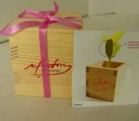 Aus der dekorativen Holzbox entwickelt sich eine echte Pflanze und auf einem Blatt steht: "Mama ist die Beste".