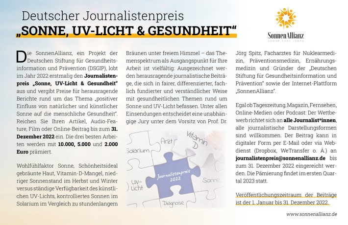 Sonne ist Leben, denn Sonnenstrahlen haben das Leben auf der Erde von Beginn an geprägt - und das ist auch heute noch so. Der Bedeutung des Sonnenlichts trägt die SonnenAllianz, ein Projekt der Deutschen Stiftung für Gesundheitsinformation und Prävention (DSGIP), Rechnung: Das Projekt, das sich zum Ziel gesetzt hat, unabhängig über die vielen gesundheitlichen Themen rund um die Sonne und das Sonnenlicht zu berichten und aufzuklären, lobt im Jahr 2022 erstmalig den Journalistenpreis "Sonne, UV-Licht & Gesundheit" aus und prämiert herausragende Berichte rund um das Thema "positiver Einfluss von natürlicher und künstlicher Sonne auf die menschliche Gesundheit".