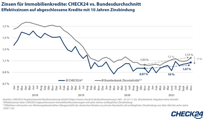 Zinsen für Immobilienfinanzierungen sind innerhalb eines Jahres leicht gestiegen. CHECK24-Kund*innen zahlten im November 2021 im Schnitt 1,07 Prozent effektiv für Baudarlehen mit zehn Jahren Zinsbindung. Das bedeutet einen Zuwachs von zehn Prozent im Vergleich zum Vorjahresmonat.1)