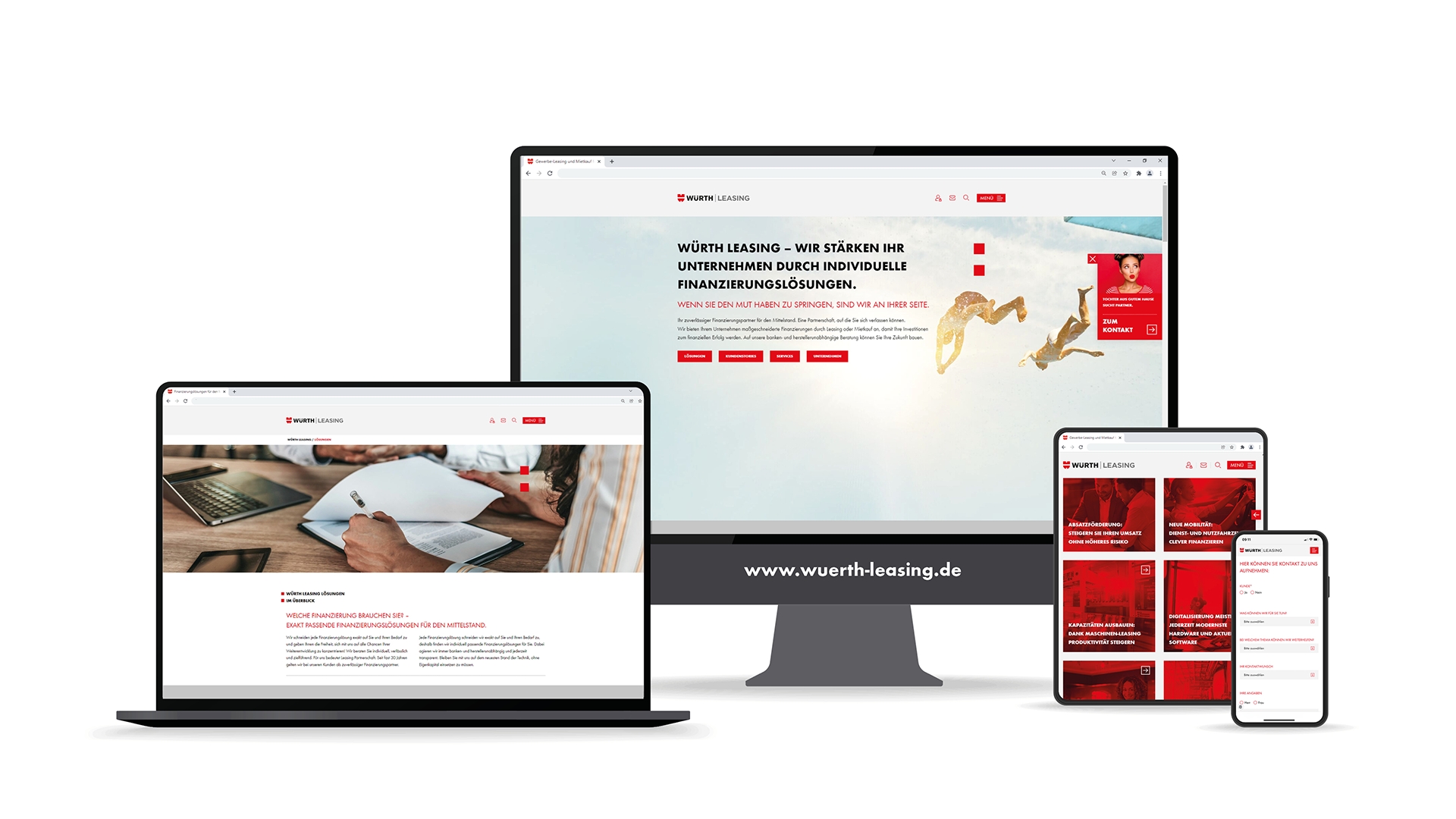 Digitale Touchpoints sind mittlerweile wichtiger denn je! Aus diesem Grund haben wir uns dazu entschieden, digital einen neuen Weg einzuschlagen und unsere neue Firmenwebseite so zu gestalten, dass unseren Bestandskunden sowie potenziellen Neukunden von Anfang an ein Höchstmaß an Service und Beratung geboten wird. Unsere Geschäftsbereiche werden klar definiert und der Mehrwert für unsere Kundinnen und Kunden herausgestellt. Die Würth Leasing bietet mehr als klassisches Leasing - als Leasinggesellschaft stärken wir Unternehmen durch individuelle Finanzierungslösungen. Diese Lösungen bieten wir Ihnen durch unsere verschiedenen Geschäftsbereiche: