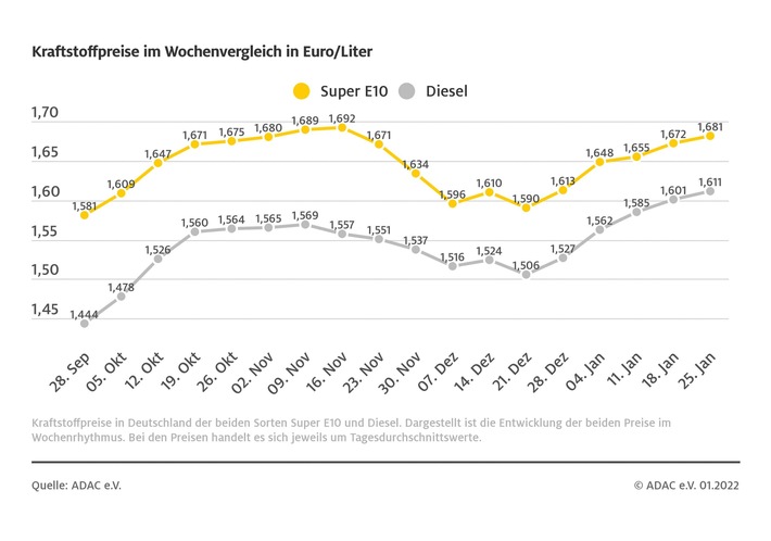 Die Preisrallye an den Zapfsäulen setzt sich fort: Für einen Liter Diesel müssen die Autofahrer in Deutschland derzeit mit einem durchschnittlichen Preis von 1,611 Euro so viel bezahlen wie noch nie. Dies zeigt die aktuelle ADAC Auswertung der Kraftstoffpreise. Im Vergleich zur Vorwoche ist Diesel damit um einen Cent teurer.