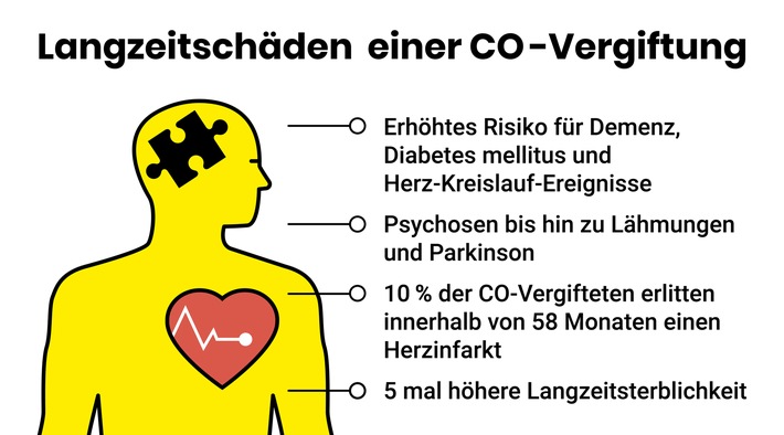 Eine akute CO-Vergiftung geht meist mit erheblichen gesundheitlichen Beschwerden, Bewusstlosigkeit und sogar Todesfolge einher. "Schon geringe Kohlenmonoxidmengen über einen längeren Zeitraum können zu chronischen Vergiftungen mit Langzeitfolgen wie Demenz, Diabetes mellitus oder Herz-Kreislauf-Ereignissen führen. Auch Psychosen, Lähmungen und vor allem Morbus Parkinson kommen immer wieder vor", erklärt Dr. Hella Körner-Göbel von der Bundesvereinigung der Arbeitsgemeinschaften der Notärzte Deutschlands e.V. (BAND).