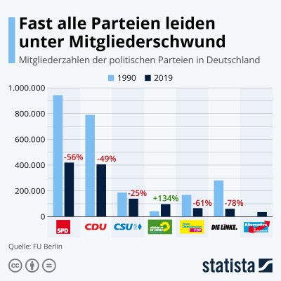 Politische Parteien und ihre Mitglieder umfassen nur einen verschwindend geringen Teil der Bevölkerung und der 64.800.000 Wahlberechtigten. Sie sind in keiner Weise legitimiert, die Interessen aller 83.000.000 Einwohner abzubilden. Es ist ein schlechter Witz! Dieses edle Ziel verfolgt keine der im Bundestag vertretenen Parteien. Die sind damit ausgelastet, sich gegenseitig zu bekämpfen oder zeitweilig widerwillig miteinander zu kopulieren, oft als flotte Dreier. Eine Grafik aus dem Jahr 2019 mag den Rückgang der Mitgliederzahlen der Altparteien bis auf Bündnis 90/Die Grünen veranschaulichen.